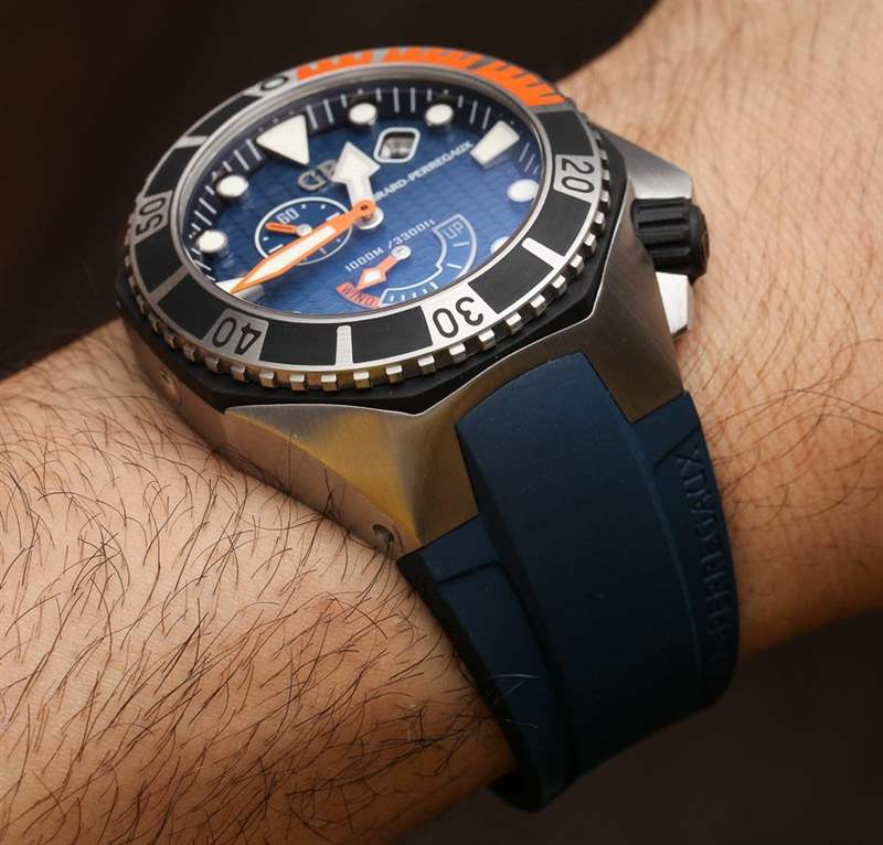 Girard-Perregaux Sea Hawk 表殼采用鋼材制成,尺寸為 44 毫米寬,但考慮到寬大的表耳和 17.1 毫米的表殼厚度,它確實磨損很大。表殼防水深度達 1000 米,帶有排氦閥,手表內部是芝柏表自制的 GP03300-0074 自動機芯。它上面有一個模塊,提供額外的功能,如動力儲存指示器、日期和輔助秒盤。雖然不對稱,但表盤仍然很平衡。我也很喜歡帶有動力儲存指示器的潛水表。順便說一句,它具有 46 小時的動力儲存,并以 4 赫茲的頻率運行。