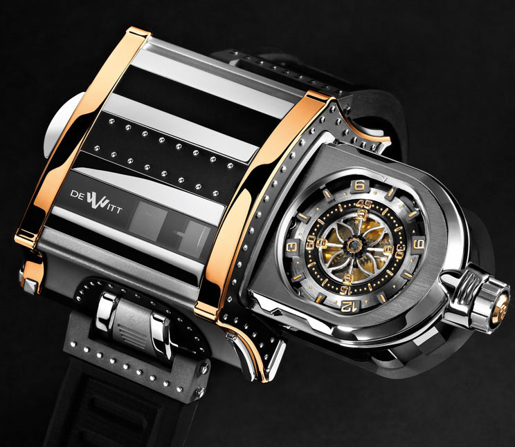 DeWitt著名的狂野 WX-1 是一款適合手腕的蒸汽朋克太空船,它有一個拉出式表殼,可以讓人們進一步檢查復雜的機芯和許多提供 21 天動力儲存的發條盒。這款手表還有一個側面安裝的陀飛輪,并設法在羅盤式顯示屏上顯示時間。僅生產了 33 枚 WX-1 手表