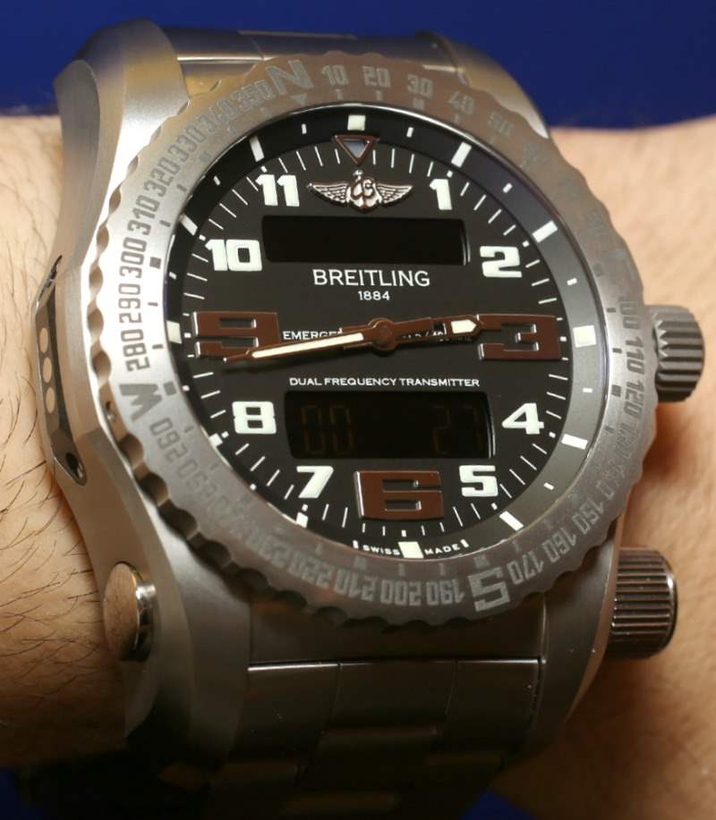 它的工作原理相當簡單。Emergency II 手表基本上是部分鐘表和部分無線電發射器。發射器有一對天線,位于手表兩側的一對膠囊中。擰開蓋子并伸出線式天線會自動激活信標系統,該系統會在大約 24 小時內定期交替向 121.5 MHz 和 406.040 MHz 頻段發送信號。該系統使用可充電電池,應每兩個月充電一次。我很高興百年靈能夠在手表的空間內管理所有這些,因為 406.040 MHz 信號需要比 121.5 MHz 頻率傳輸更多的功率。