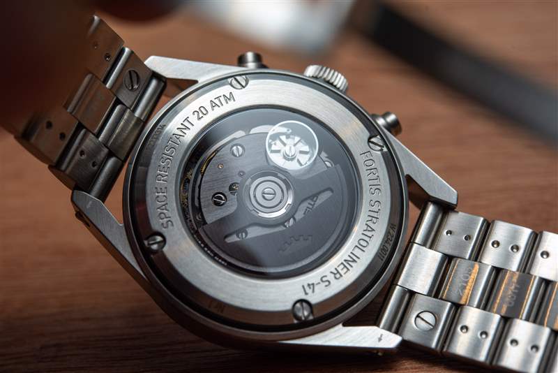 Fortis Stratoliner 由 Fortis Werk 17 提供動力 – 請注意,它不是 法語中的 “機芯” ,而是德語中的“werk ”,暗示了該品牌的 Grenchen 基地。如果您是 Fortis 的鐵桿粉絲,您會稱其為 Werk siebzehn(德語中的“17”)。Werk 17 是一款經過“平流層測試”的自制機芯,與高端機芯制造商 La Joux-Perret 合作制造,而非計時碼表 Fortis Werk 13 則由勞力士-都鐸-香奈兒旗下的 Kenissi Manufacture 制造。Werk 17 結合了 60 小時的動力儲存、軸承式自動上鏈系統和導柱輪操作的計時碼表。